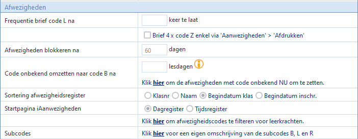 - Tot slot is er nog de mogelijkheid om met subcodes te werken. Op die manier kan je bij bv. code B een onderscheid maken tussen code B01 = spijbelen, B02 = ongeldig doktersattest, B03 = ... . Naar het departement zal vanzelfsprekend gewoon code B doorgestuurd worden. Bekijk ook dit artikel.