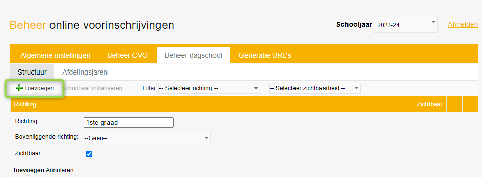 Je bepaalt zelf de boomstructuur binnen iVoorinschrijvingen. Hiervoor maak je (bovenliggende) richtingen aan via Beheer dagschool > Structuur: