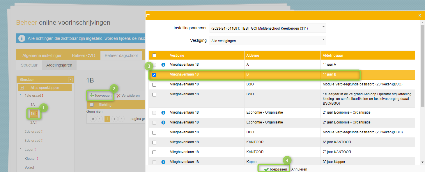 Je duidt een bepaalde richting aan (1) en klikt op 'Toevoegen' (2) om een afdelingsjaar te koppelen. Selecteer het afdelingsjaar (3) en klik op 'Toepassen' (4):