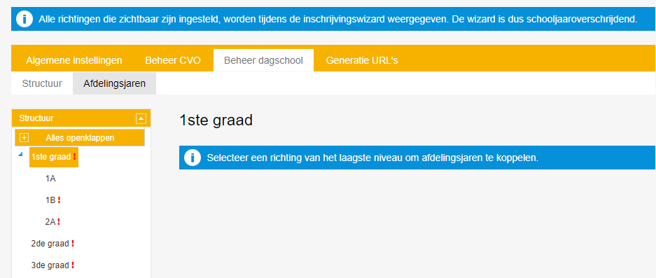 Vervolgens kan je in het beheervenster van iVoorinschrijvingen via Beheer dagschool > Afdelingsjaren de afdelingsjaren koppelen aan de richtingen binnen jouw structuur.