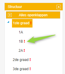 Een richting waar nog geen afdelingsjaar aan gekoppeld werd, herken je aan de hand van het rode uitroepteken. Deze richtingen worden niet getoond in de gebruikersmodule voor de leerling(en)/ouder(s):