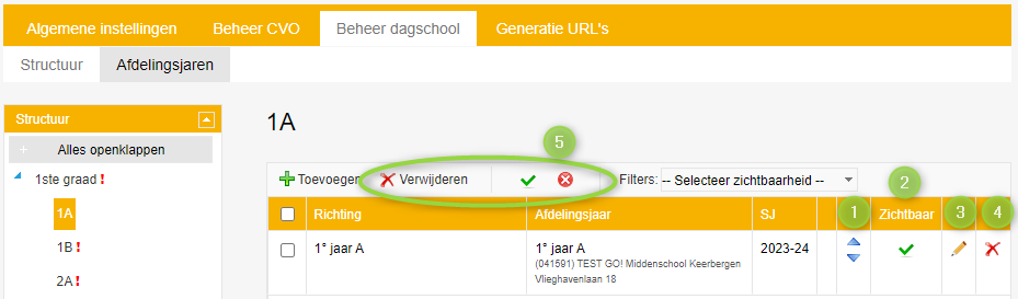 Gekoppelde afdelingsjaren kan je verplaatsen (1), zichtbaar of onzichtbaar maken voor de leerling(en)/ouder(s) (2), wijzigen (3) of verwijderen (4). Deze aanpassingen kunnen ook in bulk voor de gekoppelde afdelingsjaren door deze aan te vinken (5):
