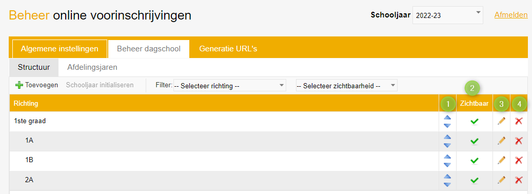 Via de dubbele blauwe pijlen bepaal je zelf de plaats van de richting(en) door deze naar boven of onder te verplaatsen(1). Richtingen kunnen zichtbaar of (tijdelijk) onzichtbaar geplaatst worden voor de gebruikers, zodat tijdelijk geen voorinschrijvingen kunnen gebeuren voor de welbepaalde richting(en) (2). Je kan richtingen naar wens wijzigen (3) en indien nodig ook verwijderen (4):