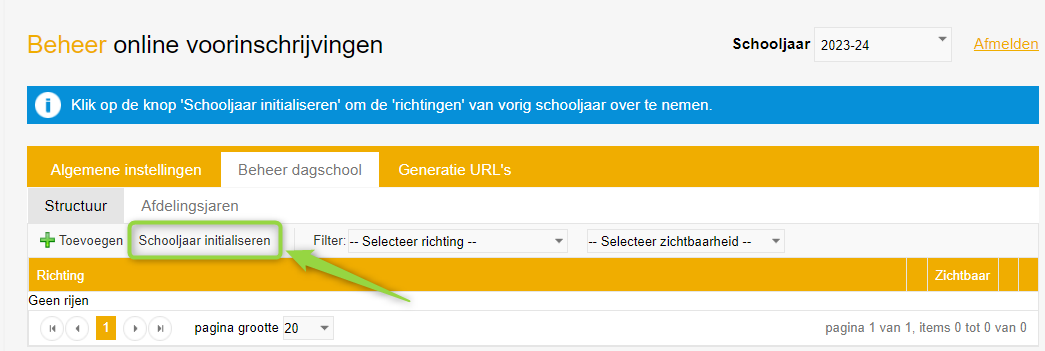 Indien een nieuw schooljaar werd aangemaakt in de leerlingenadministratie (iBasis/iLeerlingen), dan kan je de reeds opgebouwde structuur binnen iVoorinschrijvingen kopiëren naar het nieuwe schooljaar via de knop 'Schooljaar initialiseren'. Hiervoor dien je uiteraard ingelogd te zijn in het nieuwe schooljaar.