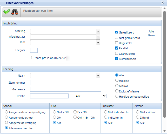 Je zoekt de leerling op via leerlingen consulteren, je dient hiervoor gebruik te maken van de filter (verrekijker links onderaan). Enkel als de filter ingesteld is zoals op onderstaande afbeelding zal je de uitgeschreven leerling terug vinden. Let er hierbij wel op dat je in de juiste school bent ingelogd.