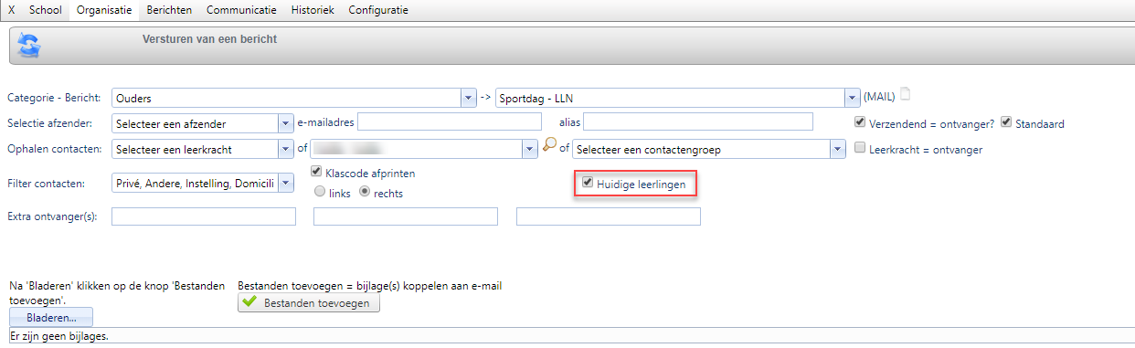 Bij het versturen van mails staat automatisch het vinkje 'Huidige leerlingen' aangevinkt. Het programma kijkt steeds naar de huidige toestand van de leerlingen. Als je een mail wil versturen naar leerlingen die later op het jaar/volgend jaar instappen, dan moet dit vinkje afgevinkt worden. Deze mogelijkheid komt er pas na het selecteren van een categorie en bericht.