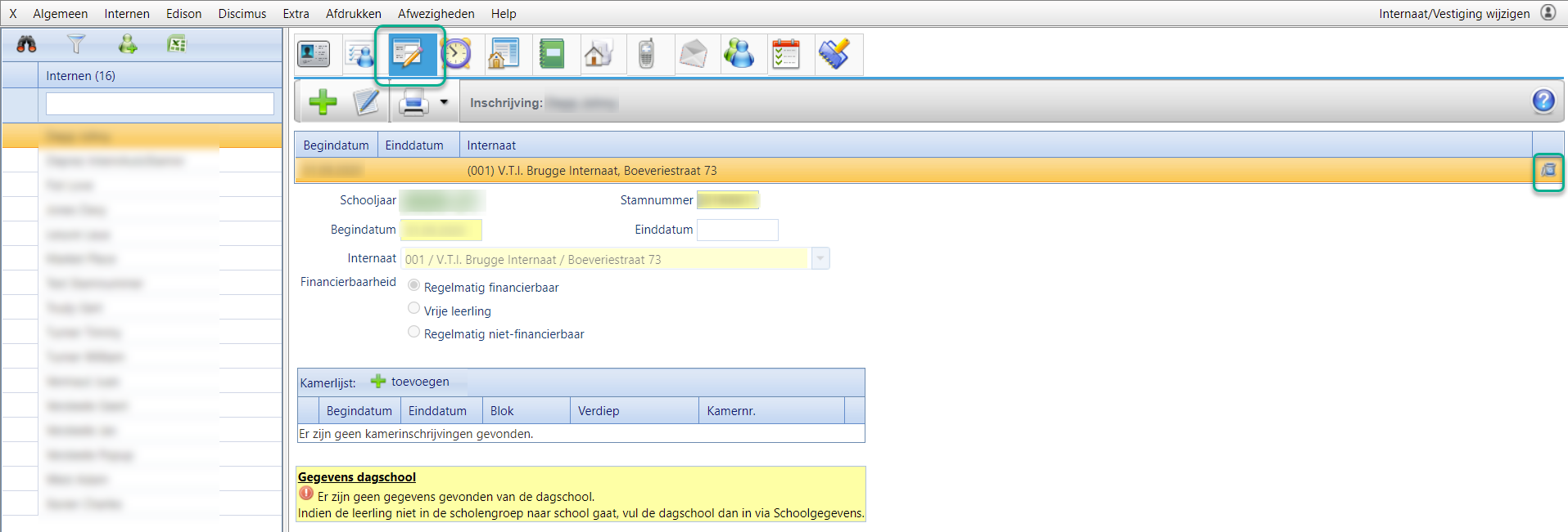 Indien je een interne hebt overgezet naar het nieuwe schooljaar, terwijl deze toch niet in het internaat zal verblijven, dan dien je in te loggen in het nieuwe schooljaar. Via het menu Internen > Consulteren roep je de leerling op en vervolgens ga je naar het tabblad 'Inschrijvingsgegevens'. Verwijder de inschrijving met de vuilnisbak achteraan de lijn: