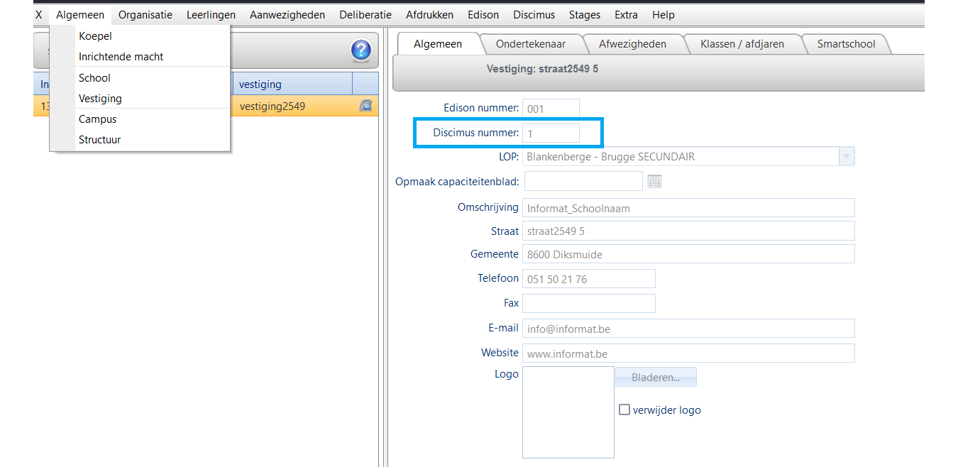 Het location ID is het Discimus nummer van je school. Dit vind je terug binnen de leerlingenadministratie onder de rubriek Algemeen - Structuur - Discimus nummer