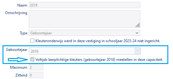 Dit veld is enkel zichtbaar vanaf schooljaar 2024-25 bij het oudste geboortejaar waarvoor in het betreffende schooljaar capaciteiten kunnen worden ingesteld, en wordt standaard aangevinkt.