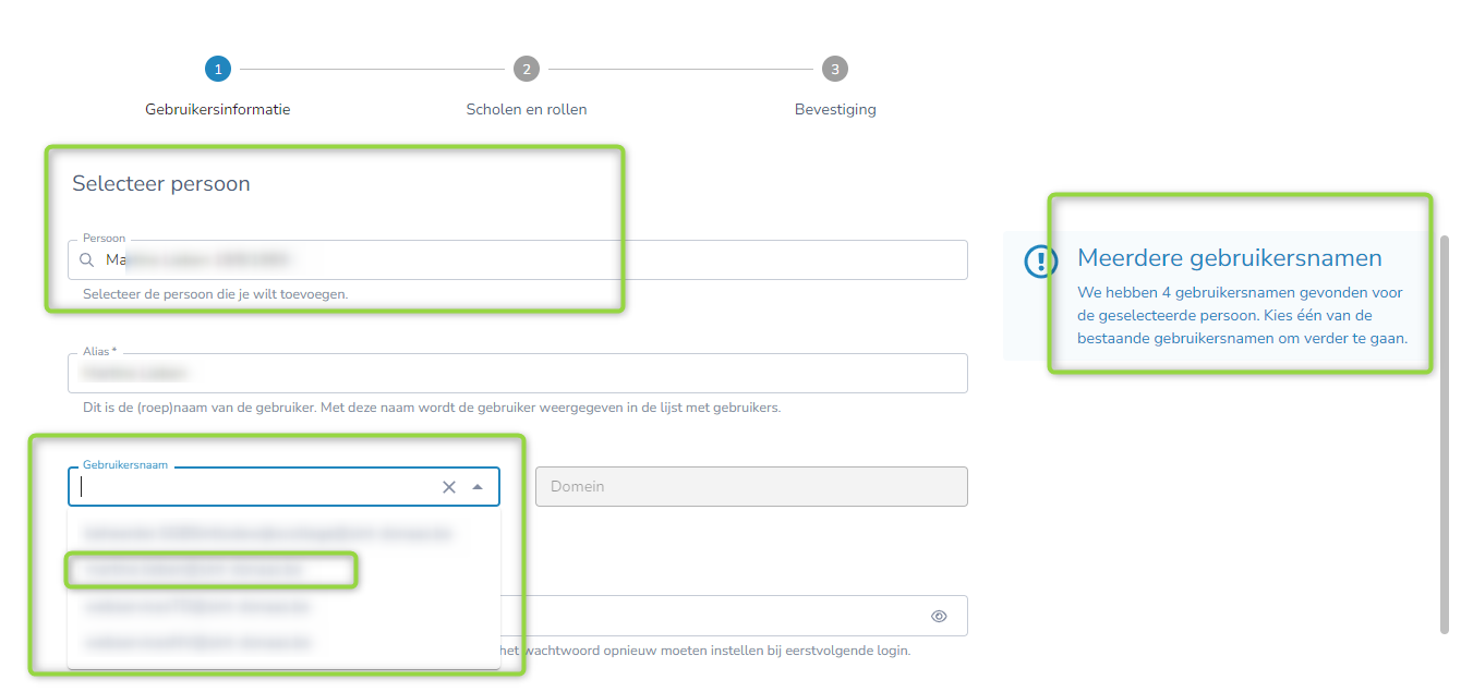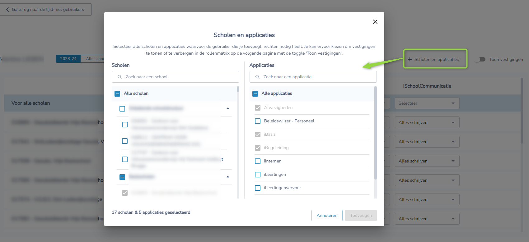 Aangezien de persoon tot hier toe nog geen rechten had op de scholen in uw beheer, moet je de gebruiker toevoegen via