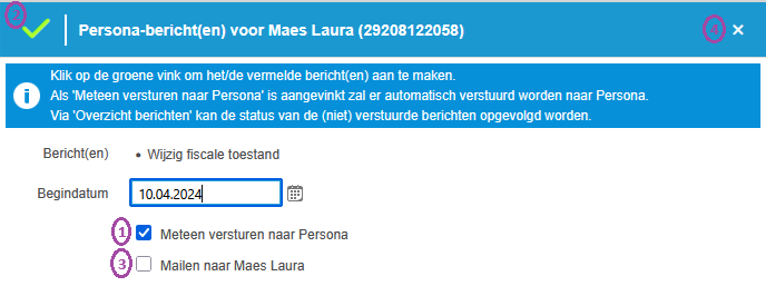 Wens je het bericht niet automatisch te versturen, dan moet je het veld 'Meteen versturen naar Persona' (1) uitvinken en krijg je volgende boodschap nadat je op de groene vink (2) hebt geklikt:
