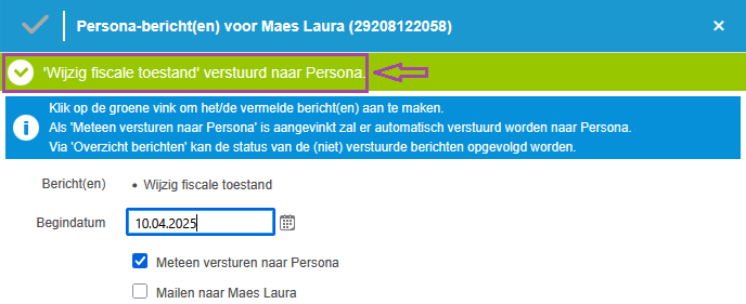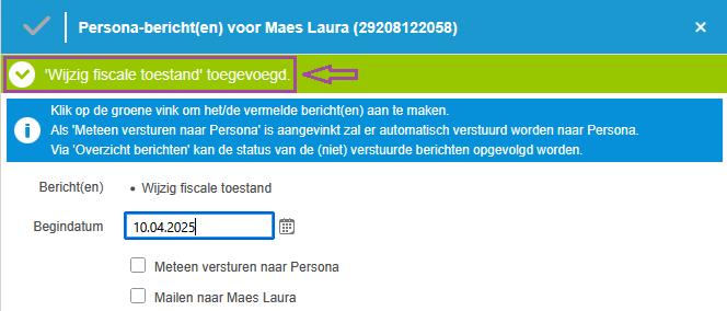 Hiervoor moeten we de optie 'Aanmaken berichten' onder de rubriek 'Persona' selecteren en op het icoontje klikken vooraan de lijn 'Wijzig fiscale toestand':
