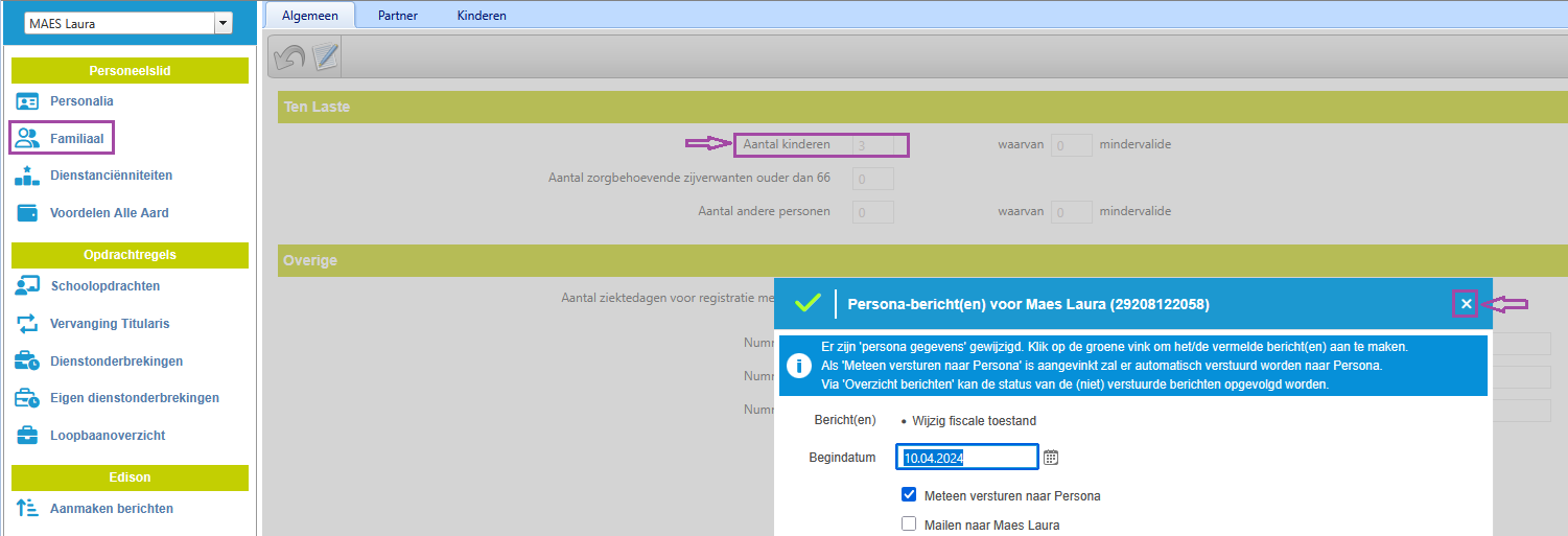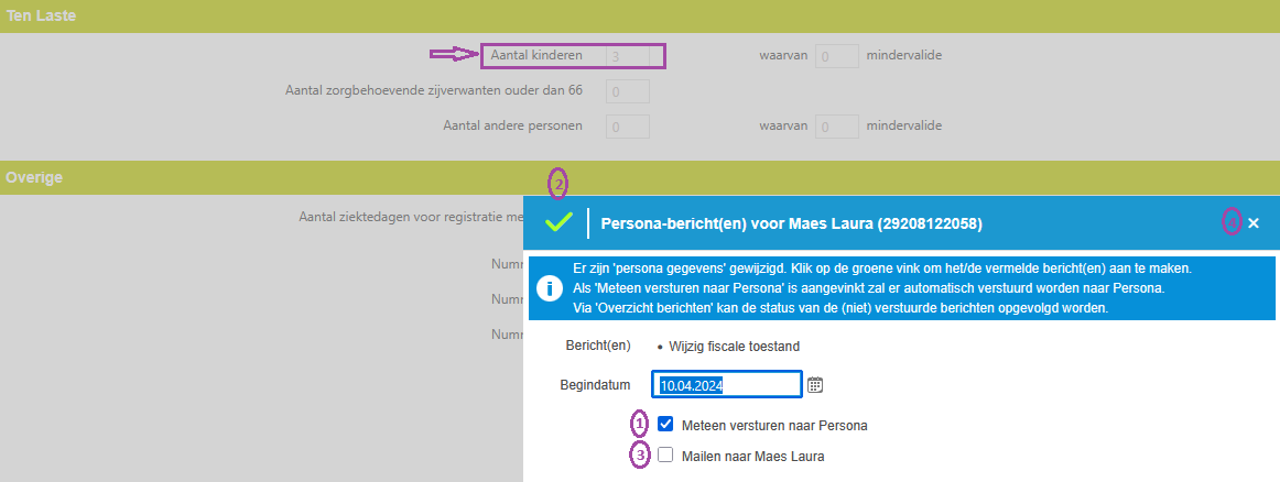 Bij het opslaan van de wijziging van 2 naar 3 kinderen krijg je een pop-upvenster aangeboden waar standaard is aangevinkt dat het bericht automatisch zal worden verstuurd naar Persona (1) wanneer je op de groene vink (2) klikt. Je kunt er optioneel voor kiezen om het Personabericht te mailen (3) naar betrokken personeelslid.