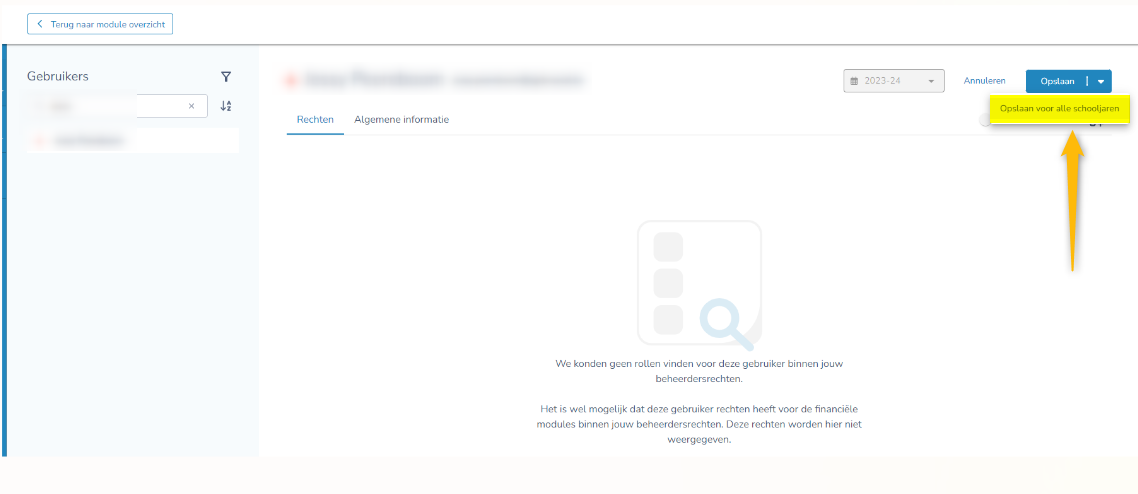 Standaard worden alle gebruikers getoond die in het vorige, huidig en volgende schooljaar rechten hebben.