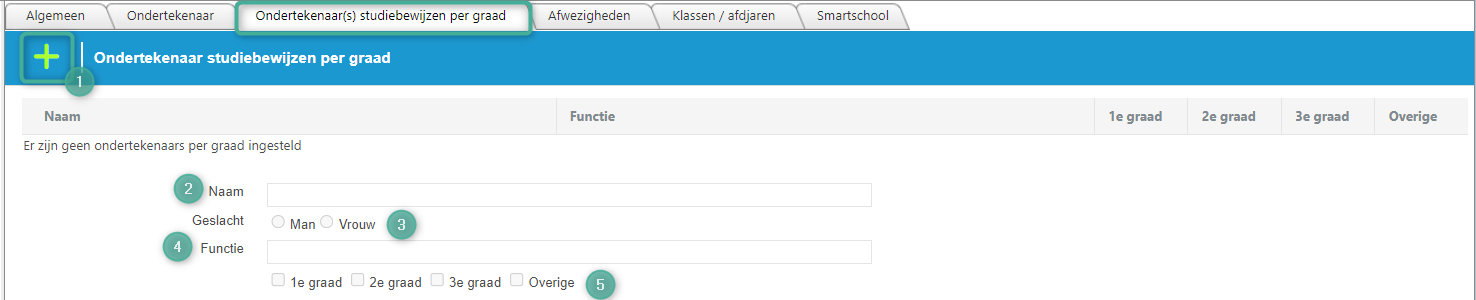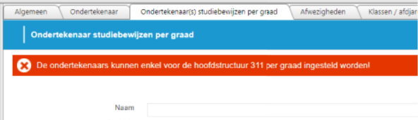 Je kan niet meer dan één ondertekenaar instellen per graad. Staan er toch meerdere ondertekenaars voor eenzelfde graad, dan zal het systeem de "oudste" ondertekenaar van de betreffende gra(a)d(en) automatisch koppelen aan de documenten.