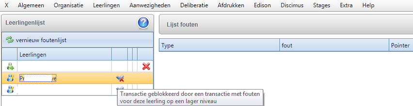 Deze transactie wordt terug in de wachtrij gezet als de fout op een bovenliggend niveau wordt opgelost. Meestal vindt u die bovenliggende fout eveneens in de foutenlijst terug (bv. nog geen stamnummer/levensbeschouwing toegekend, waardoor leerling nog niet als persoon geregistreerd is in Discimus).