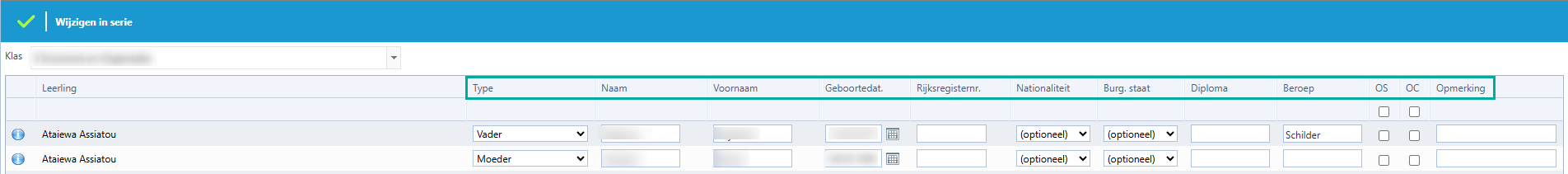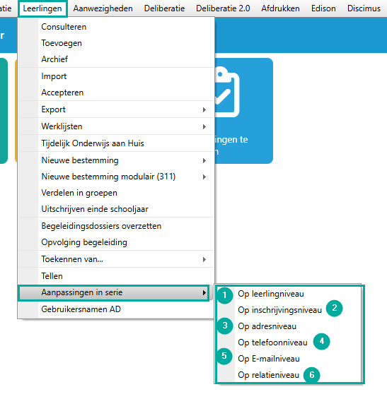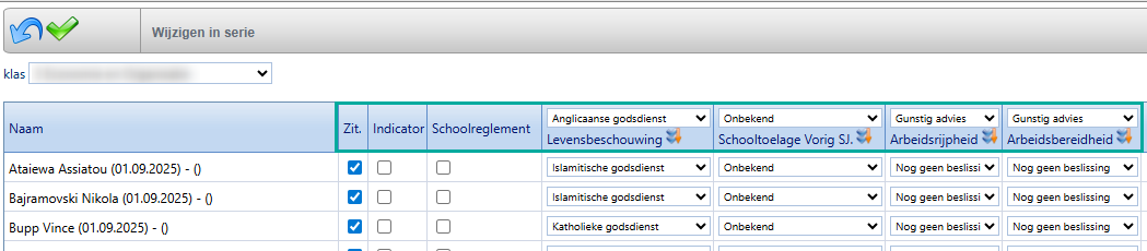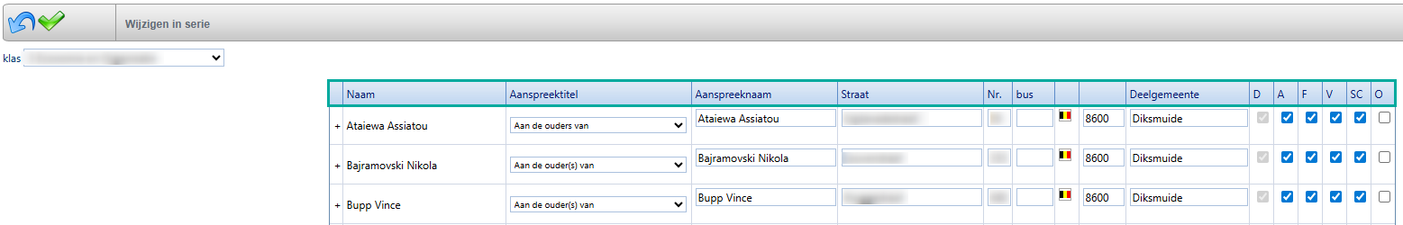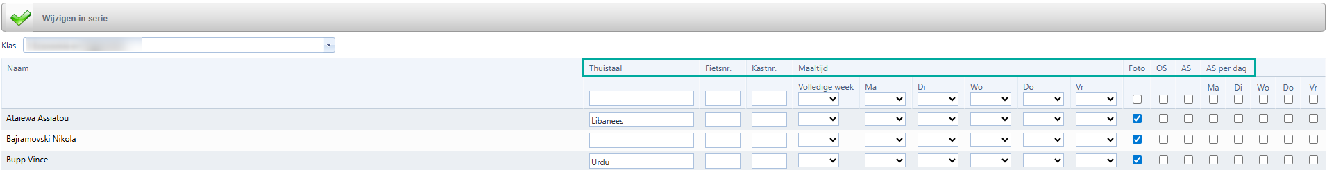 Je kunt voor meerdere leerlingen van dezelfde klas gegevens "in bulk" aanpassen langs menu Leerlingen > Aanpassingen in serie.