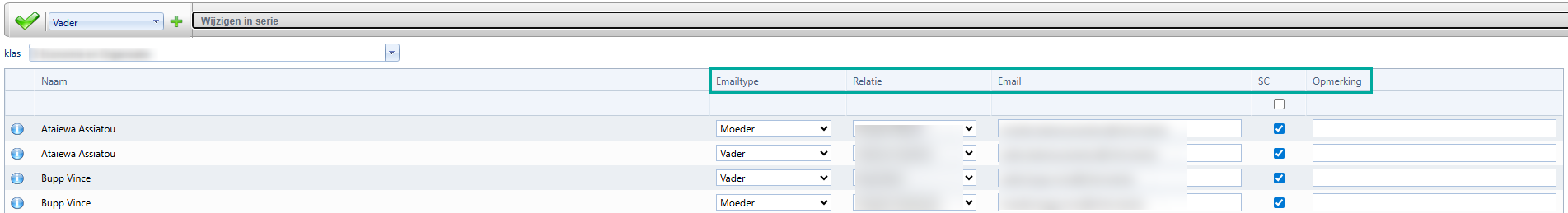 Op e-mailniveau kun je het e-mailtype, de relatie en het e-mailadres in serie aanpassen, evenals het aanduiden van schoolcommunicatie.