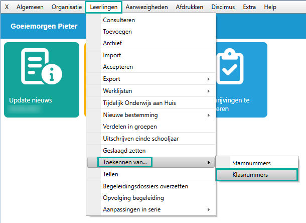 Je selecteert het tabblad Leerlingen > Toekennen van... > Klasnummers.