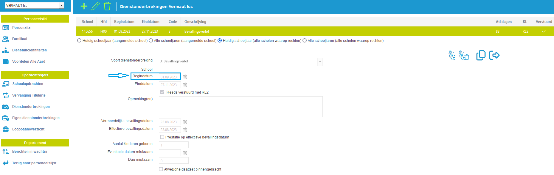 Je kan dit probleem oplossen door het aanmaken van de dienstonderbreking met begindatum van 01/09 in het nieuwe schooljaar, in het nieuwe instellingsnummer. Deze dienstonderbreking moet je NIET nogmaals versturen. Het departement zal het bevallingsverlof automatisch koppelen aan het bevallingsverlof dat in het oude instellingsnummer werd ingegeven.