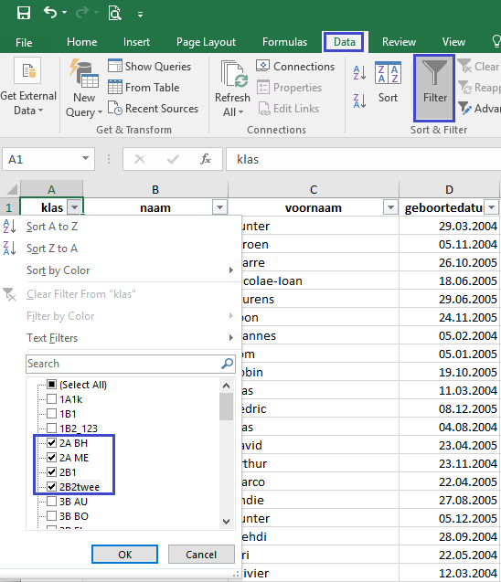 - ofwel in het Excelbestand zelf de gewenste klas(sen) selecteren: