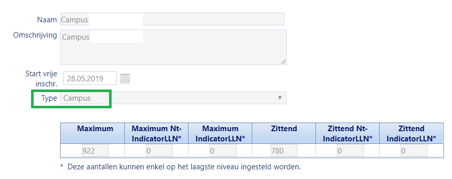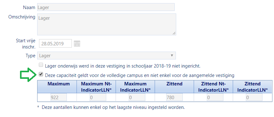 Ook op de andere capaciteitsniveaus (lager, kleuter, ...) kan je een extra veld aanvinken waarmee je aangeeft dat de betreffende capaciteit geldt voor de volledige campus en niet enkel voor de aangemelde vestiging.