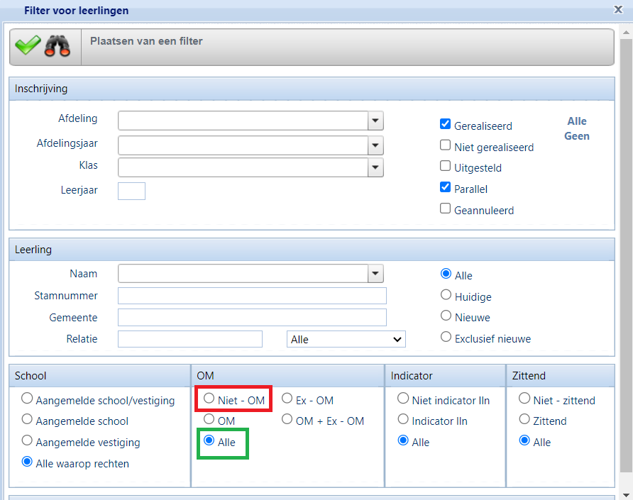 Zodra je dit aanpast naar 'Alle' zal je voortaan ook de OM-leerlingen aangeboden krijgen bij het consulteren van leerlingen (de laatst ingestelde filter wordt immers bewaard).