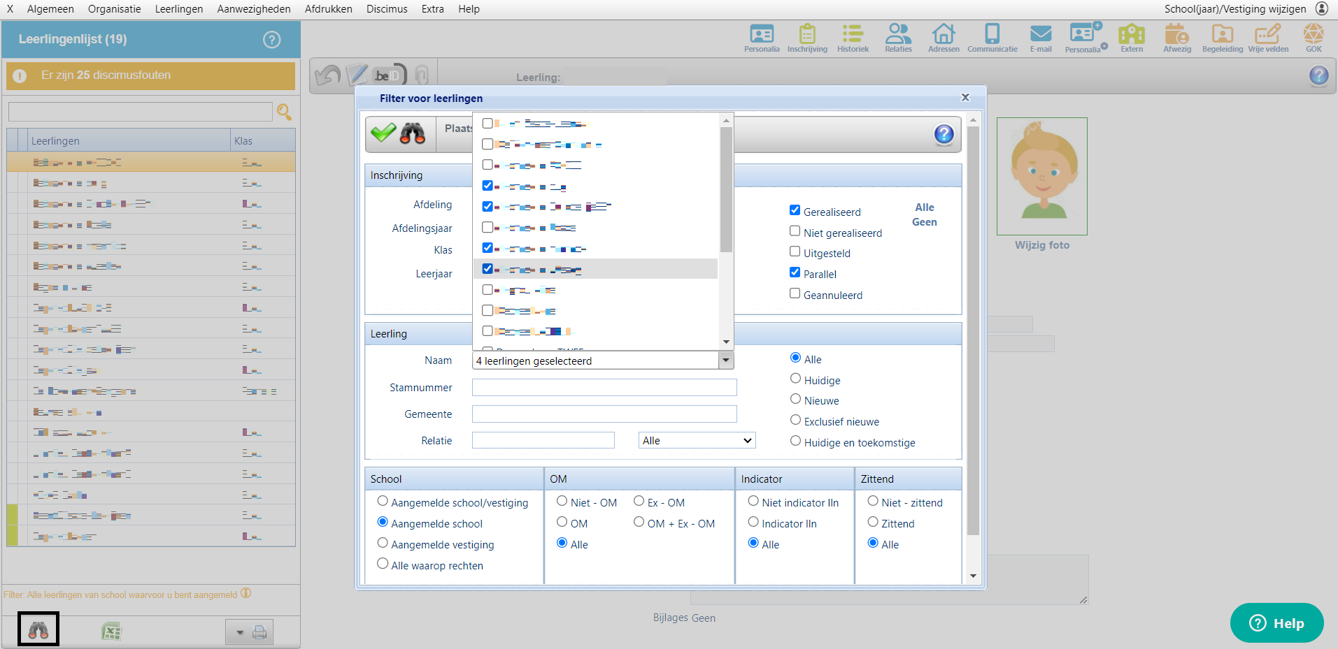 Ga naar menu 'Leerlingen - Consulteren'. Klik links onderaan op de verrekijker. Vervolgens kan u een aantal namen aanklikken.