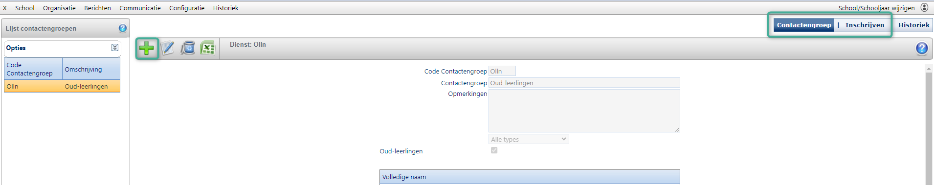 Dit is een vrijblijvende optie. Dit zijn extra groepen of mailinglists die los van de klassen en subgroepen staan die je al in iBasis/iLeerlingen hebt ingesteld. Je kan zelf contactengroepen aanmaken via het tabblad Organisatie > Contactengroepen in iSchoolcommunicatie. Je klikt op het plusje om een nieuwe groep aan te maken en vervolgens op inschrijven om leden te koppelen aan de groep.
