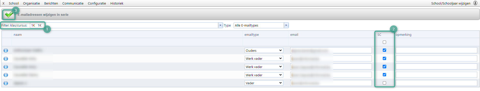 - Vink bovenaan SC (=SchoolCommunicatie) aan en vink degenen af die geen e-mail wensen;
