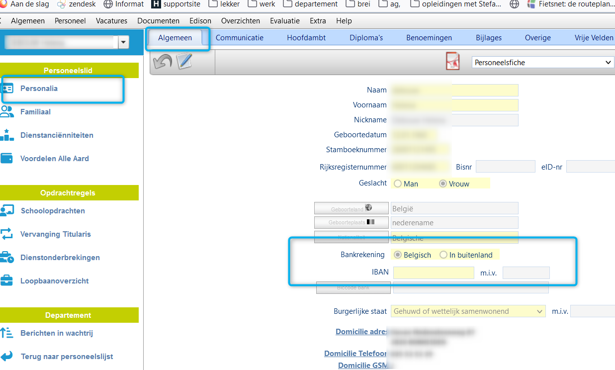 Een buitenlands bankrekeningnummer kan ingevoegd worden via Personeel > Personeel consulteren. Hierbij ga je naar het tabblad 'Algemeen' onder item 'Personalia'.