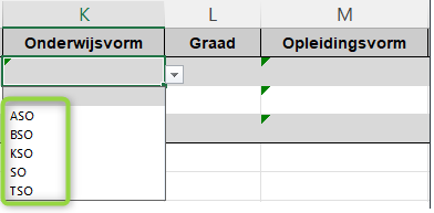 - Onderwijsvorm: ASO/BSO/KSO/TSO (enkel verplicht indien vakcode ingevuld; voor de eerste graad moet dit veld niet worden ingevuld);
