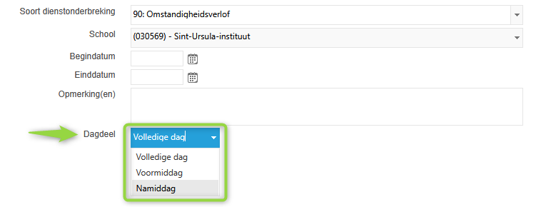 Via het veld 'Dagdeel' kun je aanduiden of het voor de volledige dag is, of enkel voor de voor- of namiddag.