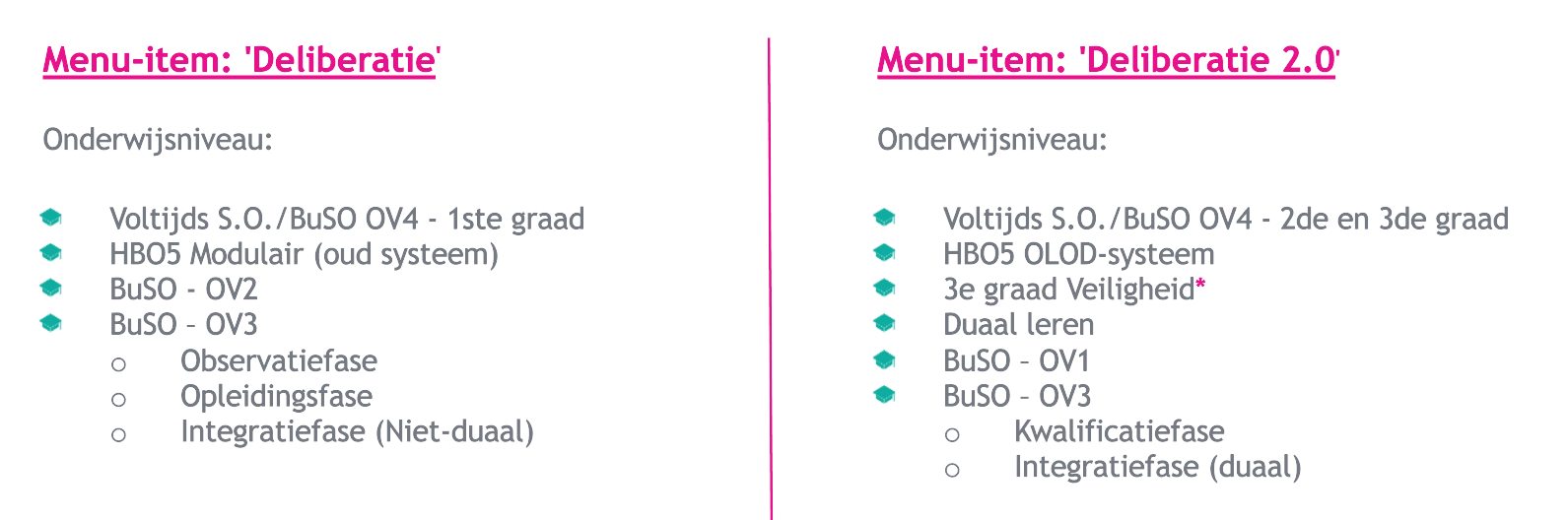 Afhankelijk van het onderwijsniveau dient de deliberatie-invoer voor schooljaar 2025-2026 geregistreerd te worden via menu 'Deliberatie' of 'Deliberatie 2.0'.