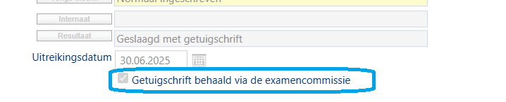 - Op de inschrijvingspagina kies je als resultaat voor 'Geslaagd met getuigschrift', vul je de uitreikingsdatum in en vink je 'Getuigschrift behaald via de examencommissie' aan.