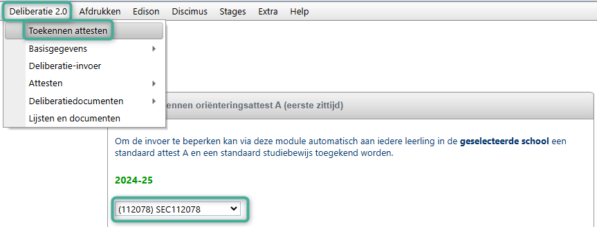 Via menu Deliberatie 2.0 > Toekennen attesten kan je in bulk elke ingeschreven leerling een A-attest toekennen.