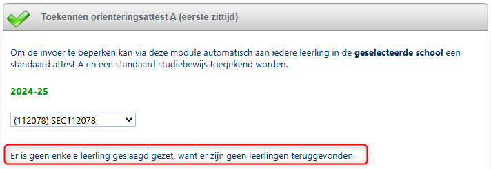 Krijg je melding "Er is geen enkele leerling geslaagd gezet, want er zijn geen leerlingen teruggevonden", dan is de reden hoogstwaarschijnlijk dat er reeds bij elke leerling een attest werd toegekend: