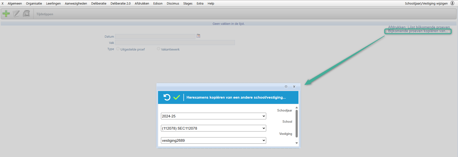 Bij de andere data kan je er zelf voor kiezen om de data te kopiëren vanuit het vorige schooljaar of vanuit een andere school/vestiging. Kies hiervoor schooljaar/school /vestiging van waaruit je de gegevens wenst te kopiëren en klik op de groene vink om dit uit te voeren: