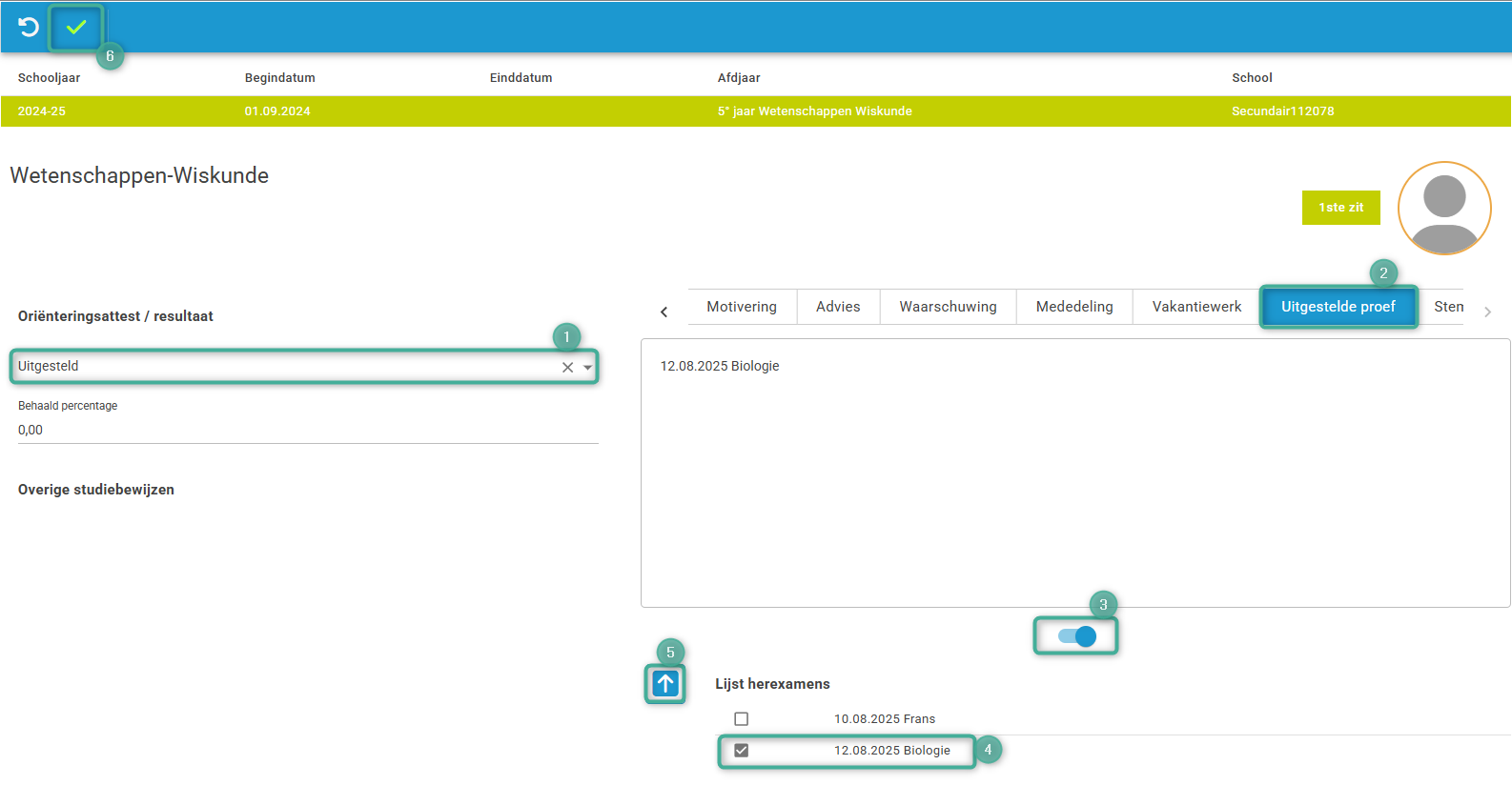 Wijzig het resultaat van de leerling (1), klik op het betreffend tabblad (2), klap het schuifbalkje open (3) en vink de uitgestelde proef aan (4). Klik op het pijltje om de uitgestelde proef te koppelen (5) en klik tot slot op de groene vink om te bewaren (6).