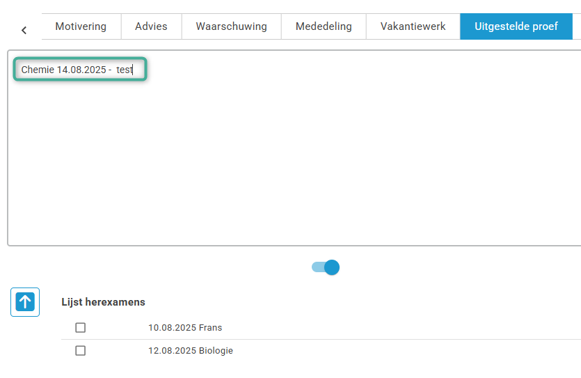 Wens je de uitgestelde proef te wissen, dan selecteer je deze in het witte kader en verwijder deze met de backspace-toets. Eenmaal het witte kader leeg is, bewaar je met de groene vink.