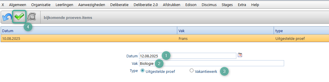 Om een uitgestelde proef/vakantietaak toe te voegen klik je op het groene plusteken. Kies de datum waarom de uitgestelde proef is voorzien of wanneer het vakantiewerk ingediend dient te worden (1), selecteer het vak waarvoor deze van toepassing is (2), duid aan of het gaat om een uitgestelde proef of vakantietaak (3) en klik op de groene vink om dit te bewaren (4).