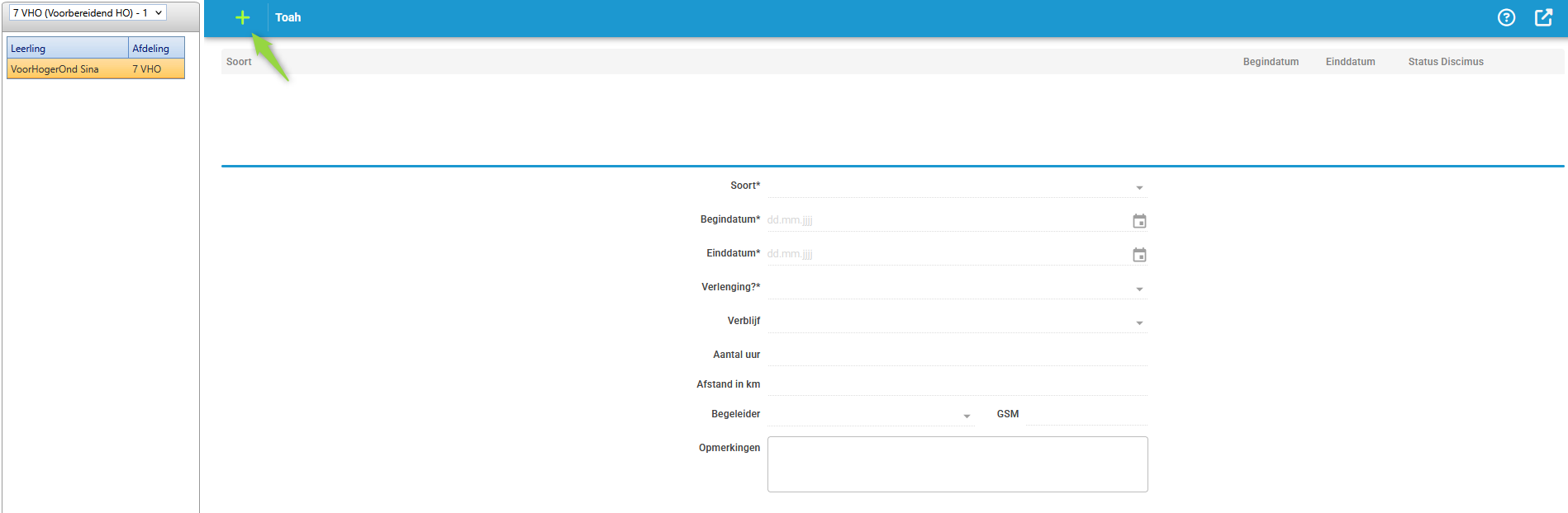 Selecteer klas/leerling en klik op het plusteken bovenaan het invoerscherm om een (nieuw) TOAH-formulier toe te voegen.