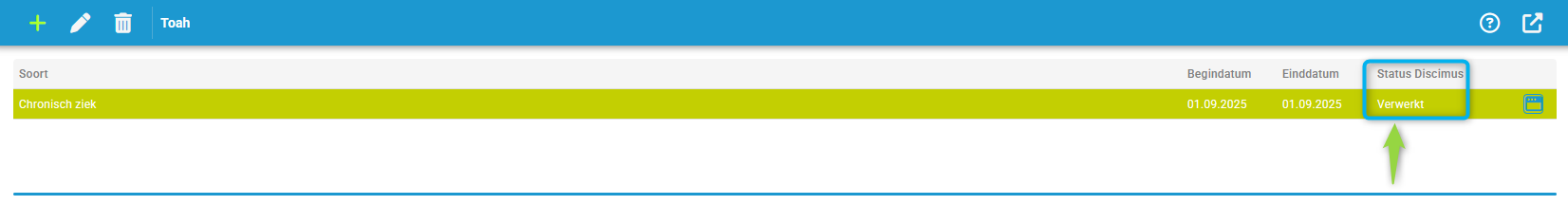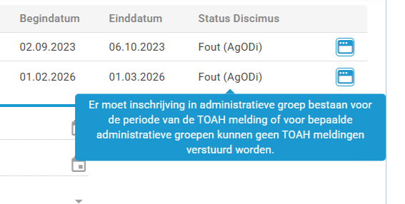 Via de knop in de rechterbovenhoek kan je de TOAH-berichten die effectief geregistreerd zijn in Discimus raadplegen. In principe moet dit overeenkomen met de verwerkte TOAH-berichten op de onderliggende pagina.
