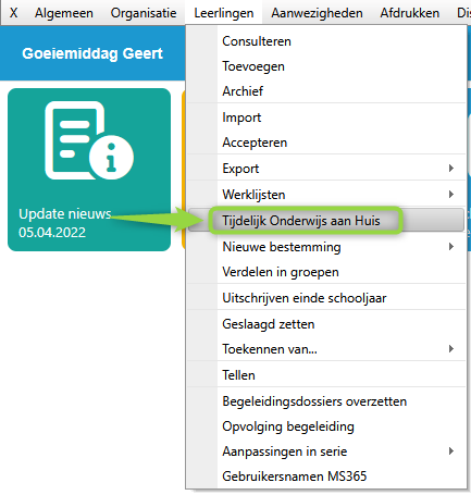 Ga naar menu Leerlingen > Tijdelijk Onderwijs aan Huis.
