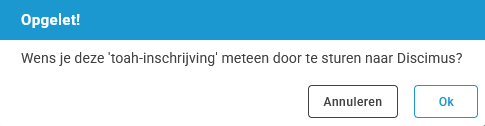 Bij het opslaan krijg je de mogelijkheid om het TOAH-bericht al dan niet meteen te versturen naar Discimus.