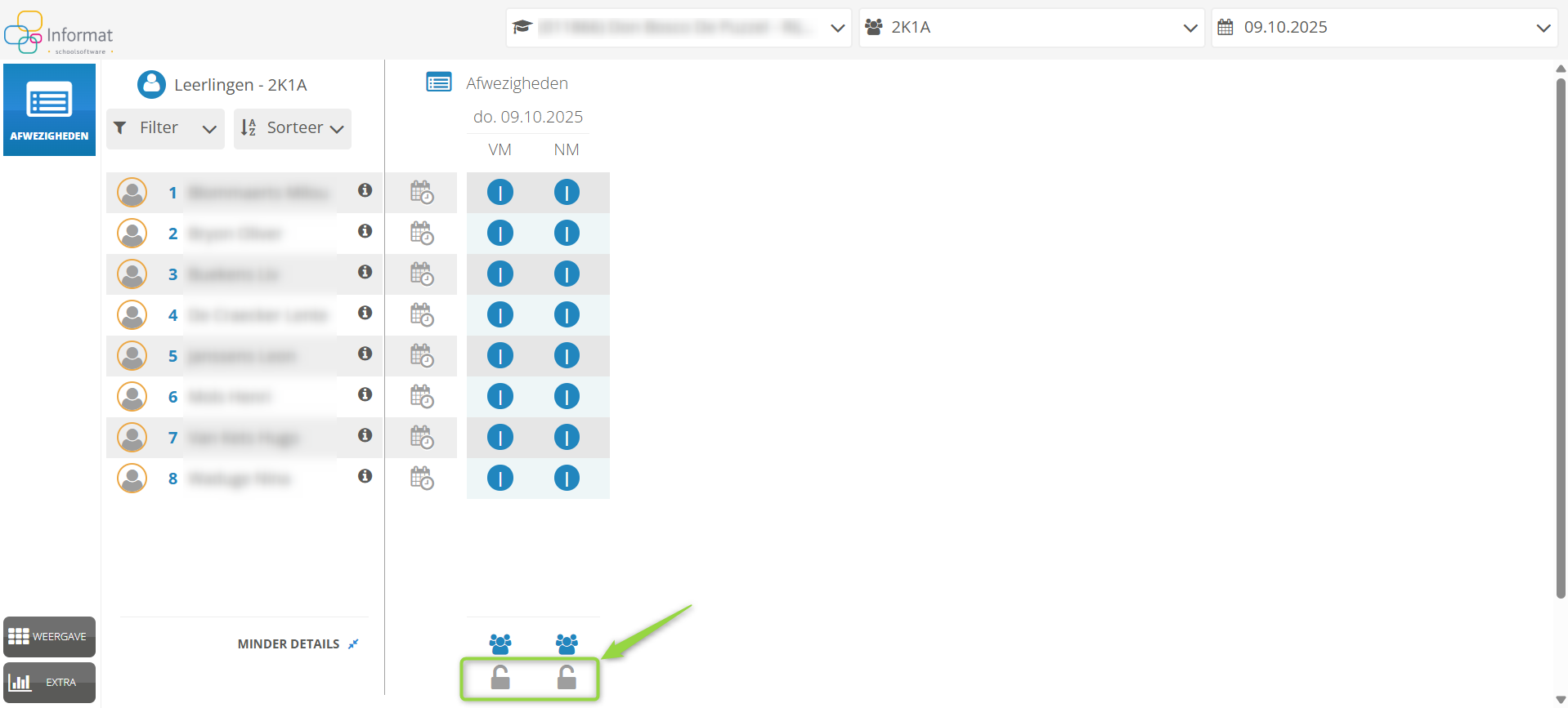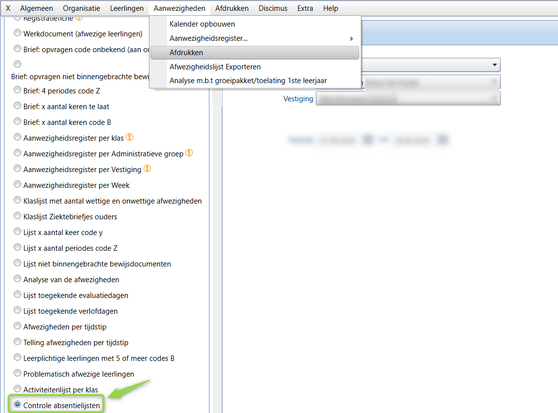 In de leerlingenadministratie kan onder menu 'Aanwezigheden' - 'Afdrukken' de afdruk 'Controle absentielijsten' afgedrukt worden. Hierop staat per klas vermeld op welke data de slotjes nog niet gesloten zijn. Handig om aan de leerkrachten te bezorgen, ter nazicht van die dagen.