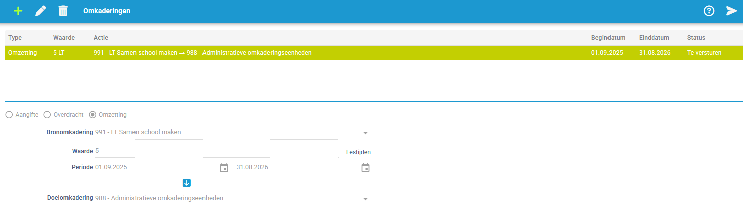 • Een omzetting is het omzetten van een omkadering naar een andere omkadering in hetzelfde schooljaar én hetzelfde instellingsnummer.