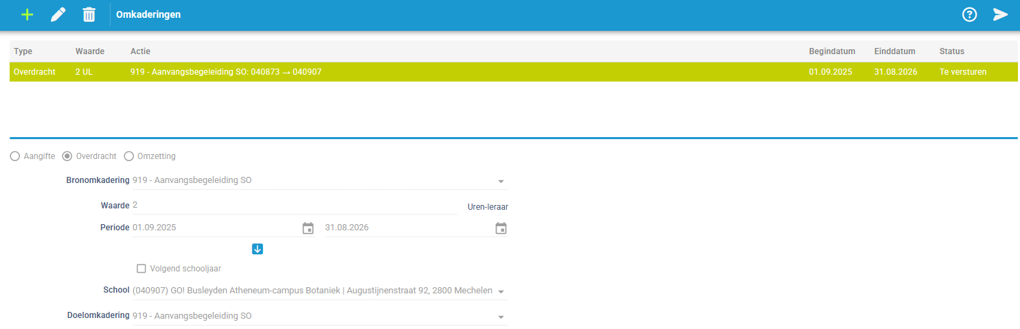 Langs menu 'Algemeen' > 'School' > tabblad 'Omkaderingen' kun je als school de aangifte(n), overdracht(en) en omzetting(en) inbrengen/doorsturen/raadplegen.