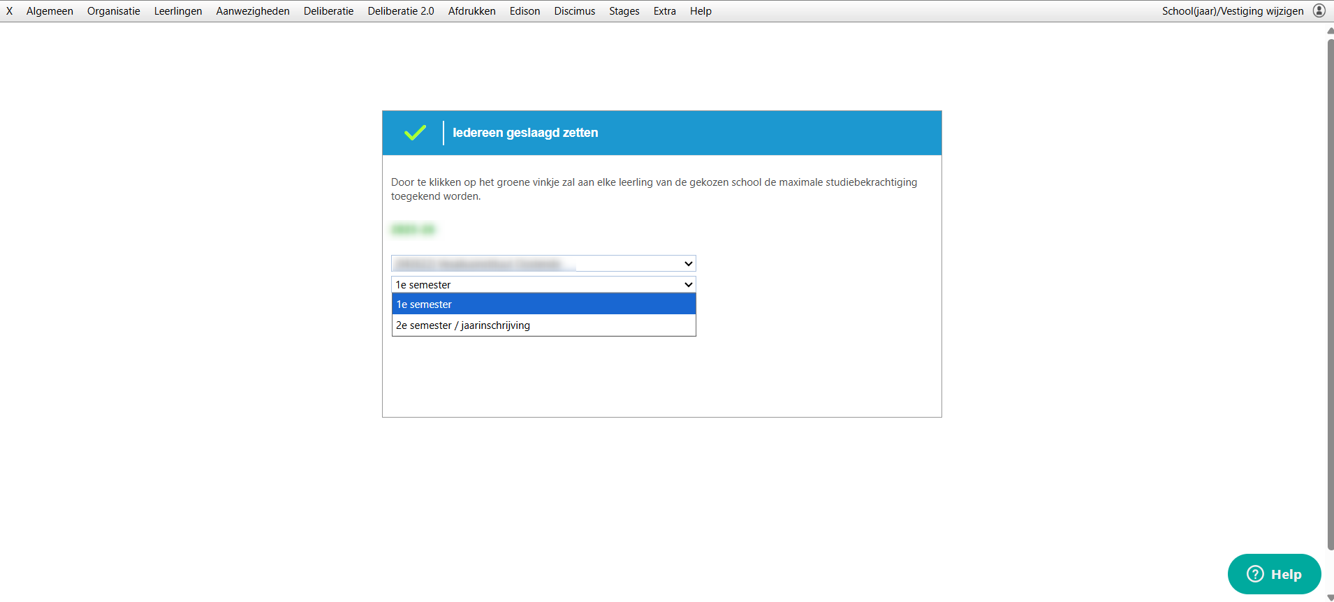 Langs menu 'Deliberatie 2.0' > 'Toekennen attesten' kun je ervoor opteren om énkel de inschrijvingen en OLOD-inschrijvingen van het eerste semester op 'Geslaagd' te zetten.