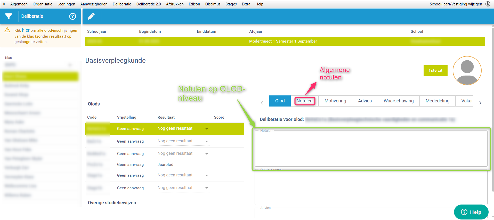 OLOD's waarvoor de student(e) vrijstelling heeft (of aangevraagd) én de OLOD's waarvoor de student(e) geen vrijstelling heeft gekregen maar waarbij de leerling de OLOD toch niet volgt kunnen/moeten niet gedelibereerd worden (er wordt geen keuzelijst aangeboden in de kolom 'Resultaat').